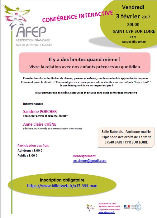 "Il y a des limites quand même! Vivre la relation avec nos enfants précoces au quotidien" Renseignements et Inscriptions |