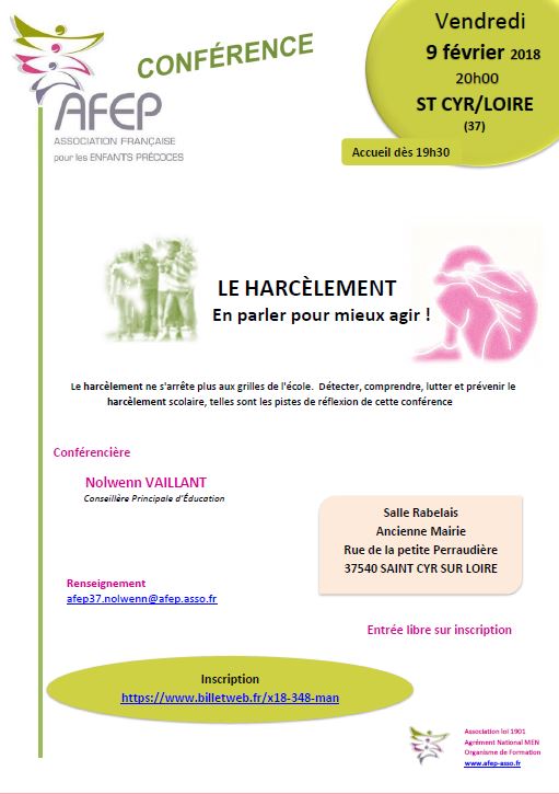| Vendredi 9 février 2018 à ST-CYR/LOIRE CONFÉRENCE "Le harcèlement – En parler pour mieux agir"