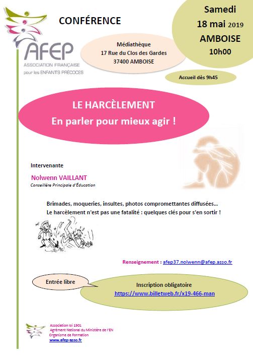 | CONFERENCE à AMBOISE Samedi 18 mai 2019 "Le harcèlement – En parler pour mieux agir!" Renseignements et Inscriptions |