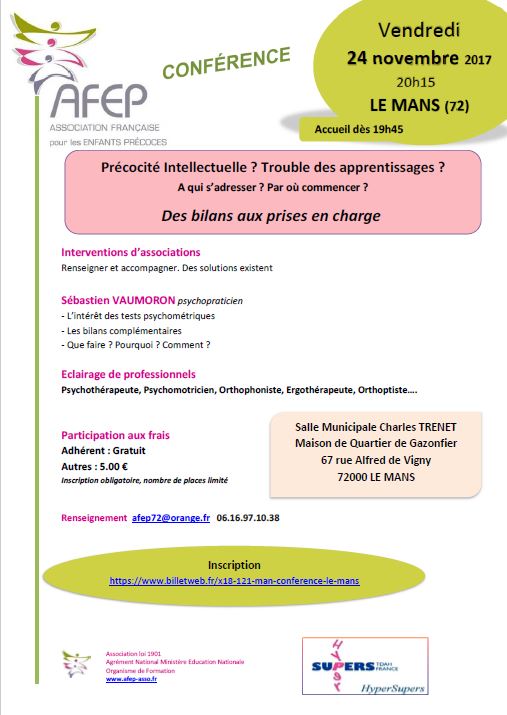 CONFERENCE    "Précocité intellectuelle? Troubles des apprentissages? Des bilans aux prises en charge – A qui s'adresser? Par où commencer?"