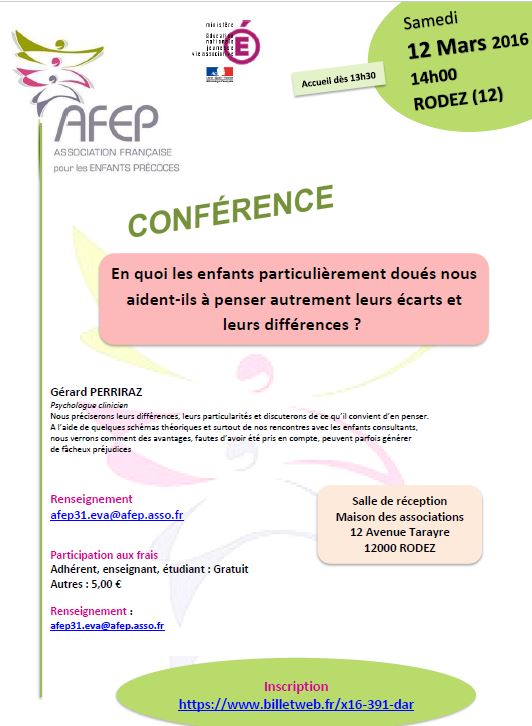 | | Samedi 12 mars 2016 à RODEZ CONFERENCE "En quoi les enfants particulièrement doués nous aident-ils à penser autrement leurs écarts et leurs différences?" Renseignements et Inscriptions | | | | | | | | | | | | | | | | | |