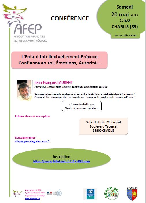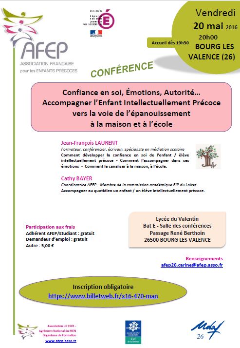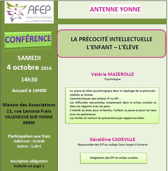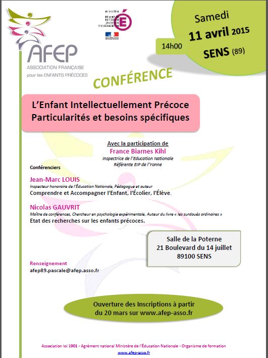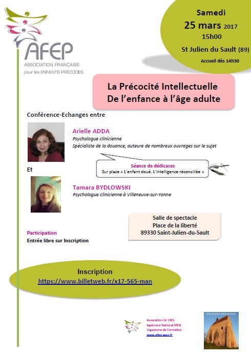 | Samedi 25 mars 2017 à St-JULIEN DE SAULT CONFERENCE "La précocité intellectuelle, de l'enfance à l'âge adulte" Renseignements et Inscriptions |
