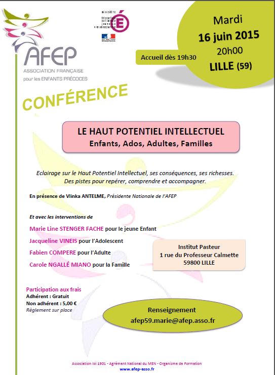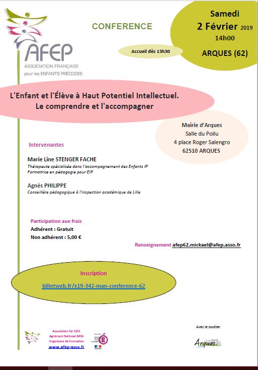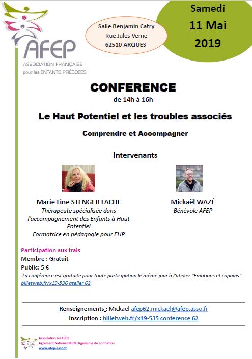 | CONFERENCE à ARQUES Samedi 11 mai 2019 "Le Haut Potentiel et les troubles associés" Renseignements et Inscriptions | | | | | | | | | | | | | | | | | | |