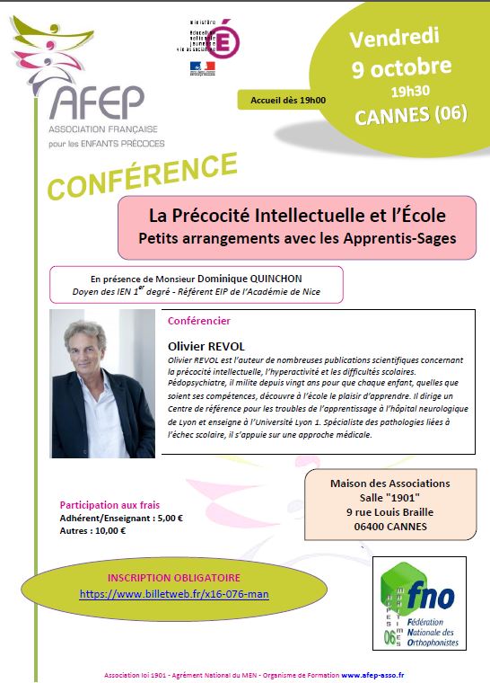 Conférence à MOUANS-SARTOUX 06                                            "Grandir avec un haut potentiel intellectuel et l'école, une mission impossible Un autre regard sur la douance"