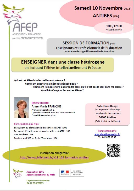 "Enseigner dans une classe hétérogène en incluant l'élève intellectuellement précoce"  Renseignements  et  Inscriptions