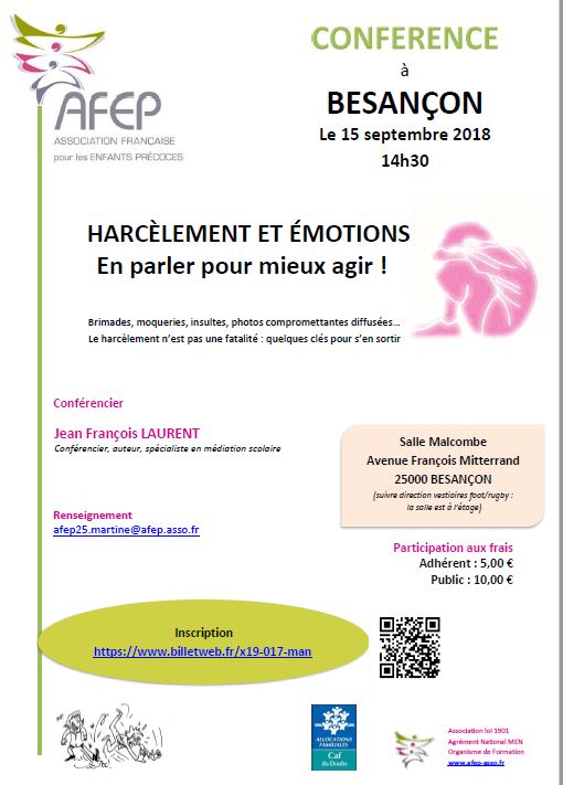 "Harcèlement et émotions – En parler pour mieux agir" Renseignements et Inscriptions | | | | | | | | | | | | | | | | CONFERENCE à BESANÇON 25