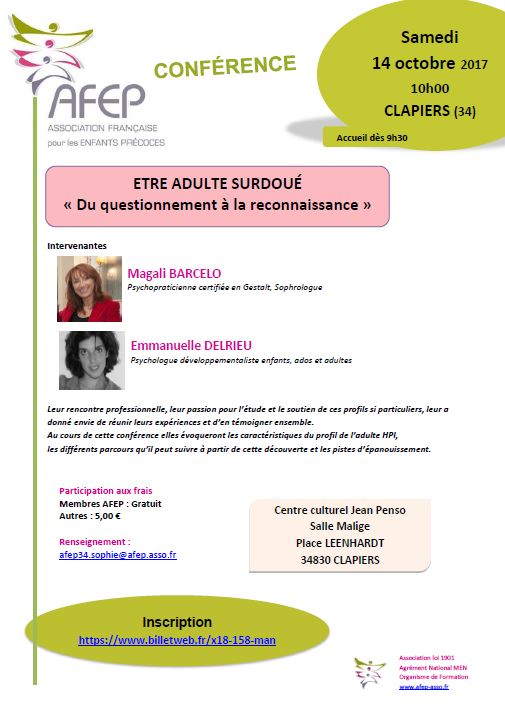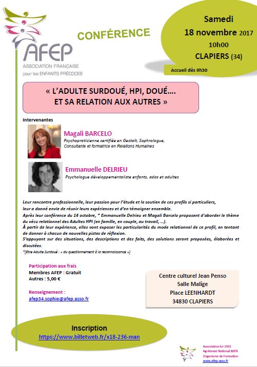 "L'adulte surdoué, HPI, doué… et sa relation aux autres"  Renseignements  et  Inscriptions